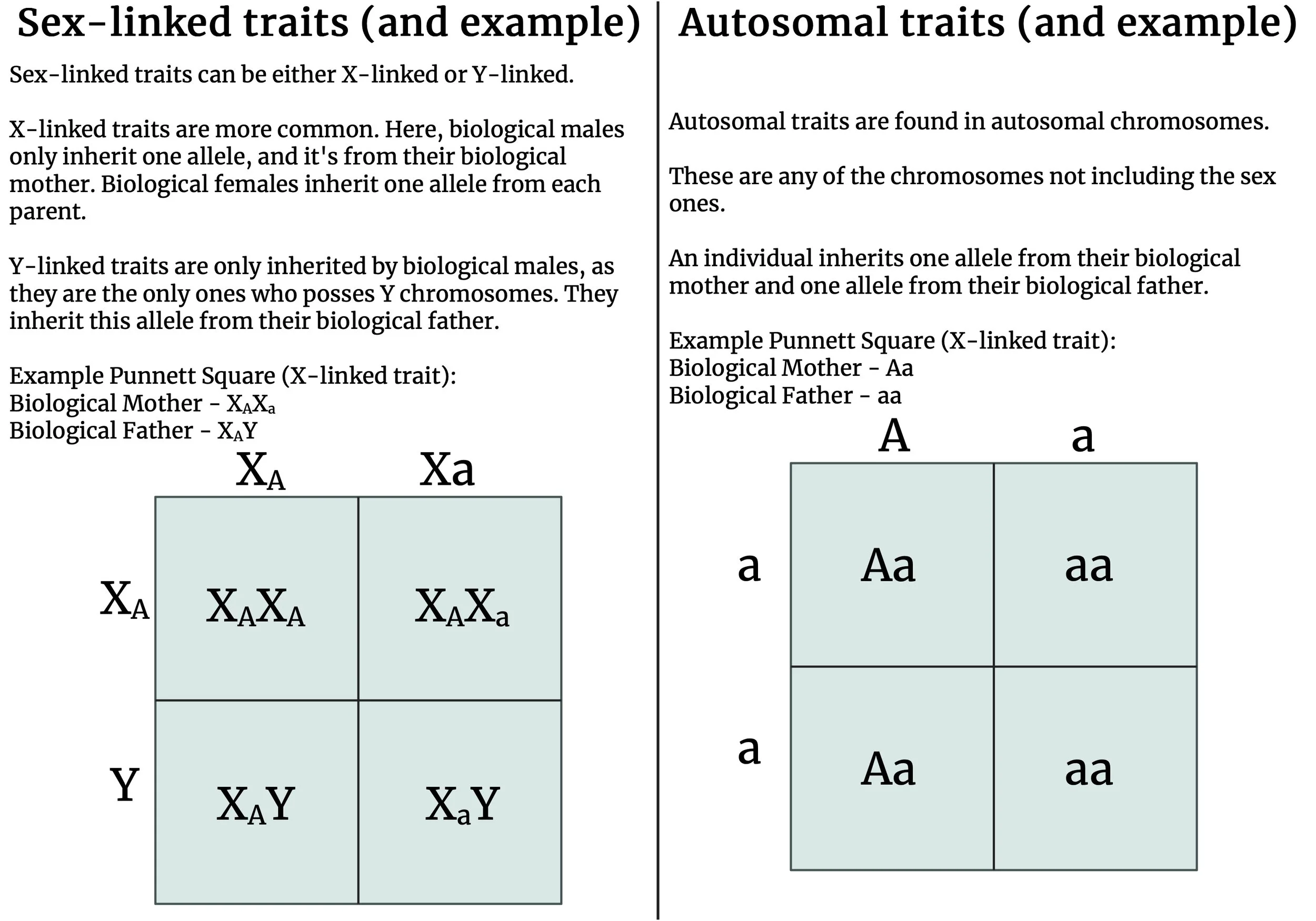 Alleles can be dominant (big letter, like A) or recessive (little letter, like a).