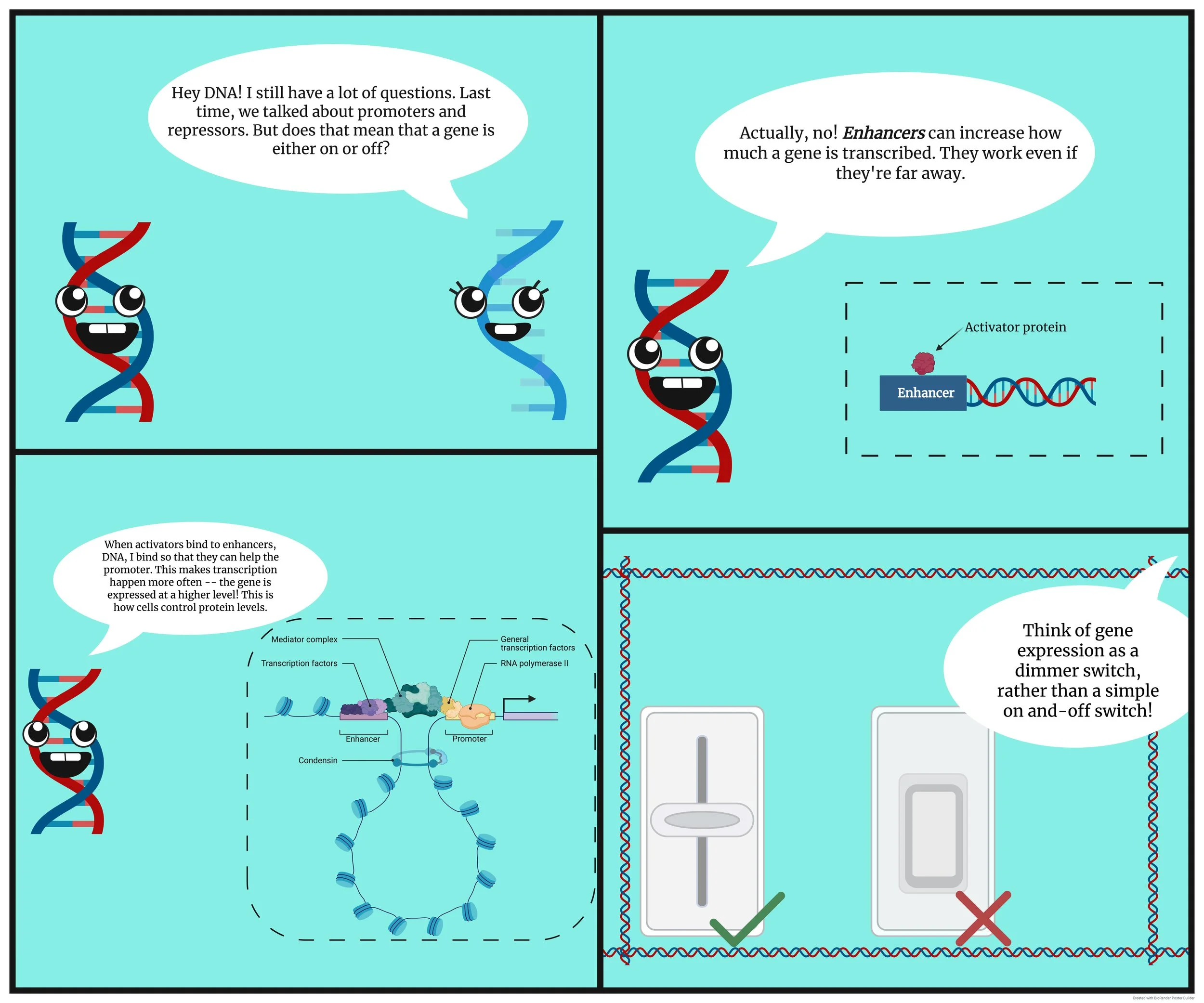 Think of a gene as a room light. The promoter is the lightbulb’s socket—you can plug the bulb in and, with the right wiring, the light comes on. An enhancer is the dimmer switch somewhere across the room (or the attic), wirelessly tweaking how bright that bulb shines. It doesn’t have to sit next to the gene it controls; it loops over, sends a signal, and tunes expression up or down.